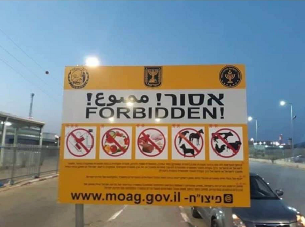 صورة لقرار الاسرائيلي على شكل لافتة تمنع دخول اللحوم والالبان والاجبان والمواد التموينية والاثاث من الضفة الى اسرائيل.