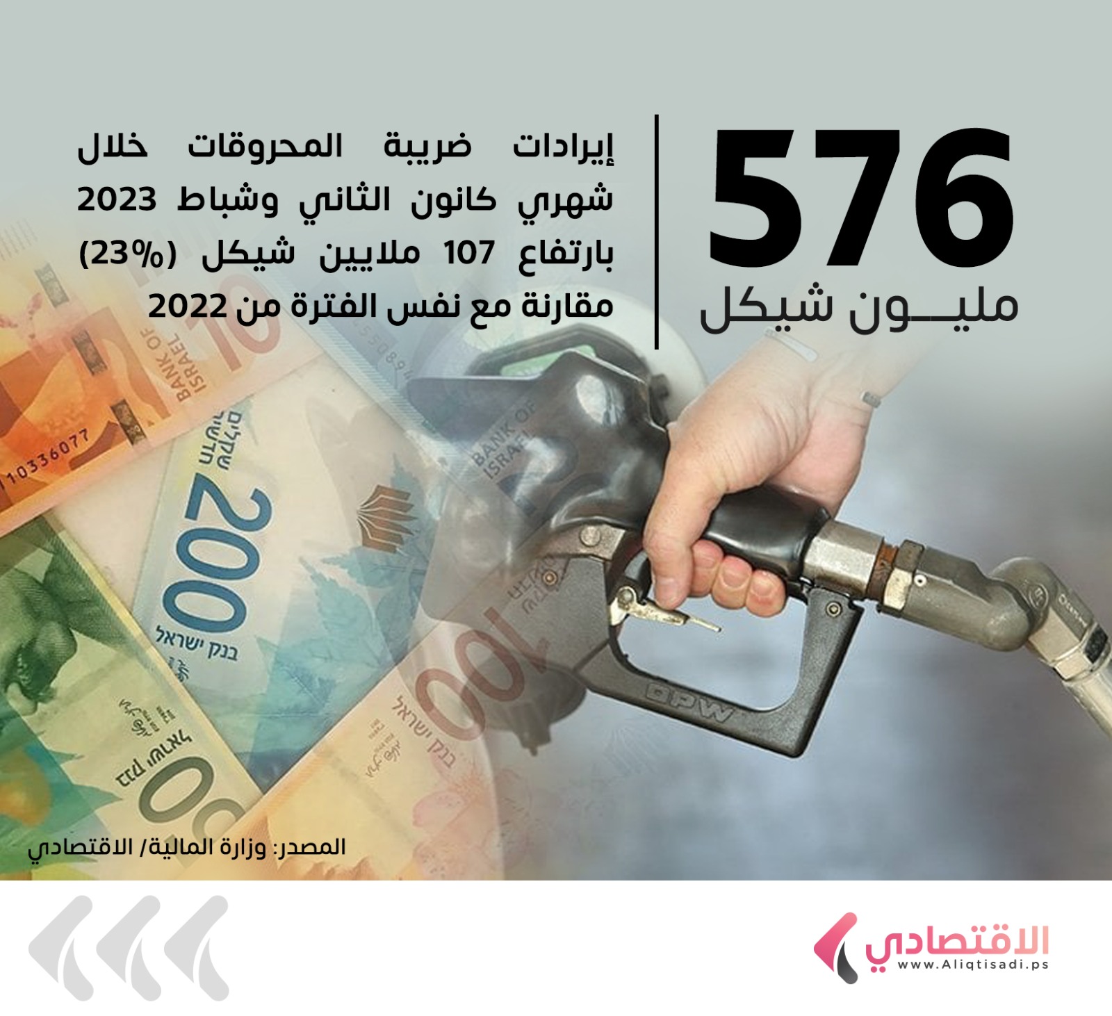 الاقتصادي: صعدت إيرادات ضريبة المحروقات بقيمة 107 مليون شيكل ما نسبته 23% خلال شهري كانون الثاني وشباط 2023 مقارنة مع نفس الفترة من العام الماضي 2022.