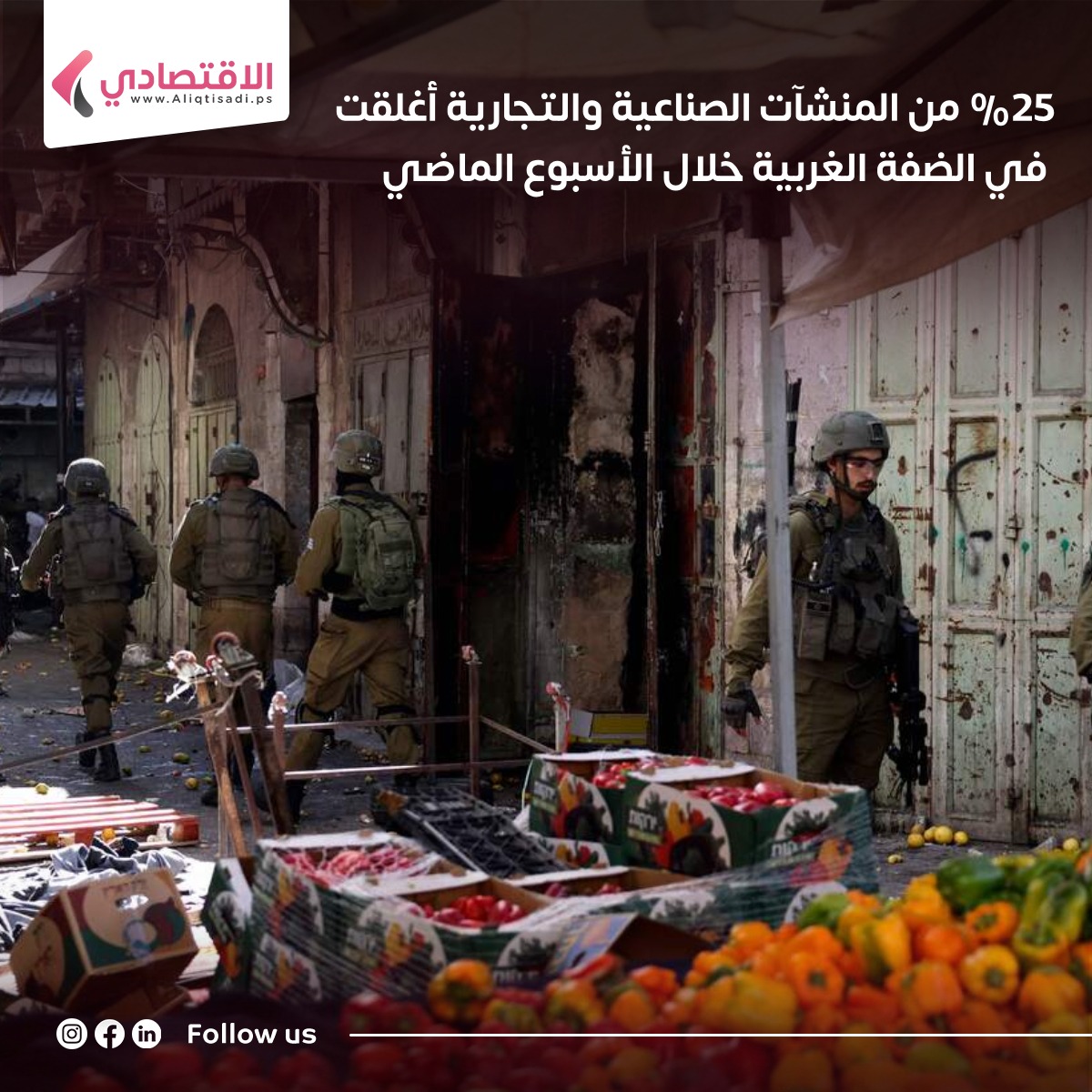 الاقتصادي- أغلقت 25% من المنشآت الصناعية والتجارية في الضفة الغربية، بشكل كامل أو جزئي، مع استمرار التوقف شبه التام لعجلة الإنتاج في قطاع غزة نتيجة العدوان الإسرائيلي المستمر على فلسطين، وفق ما أظهره المرصد الاقتصادي لوزارة الاقتصاد الوطني.
