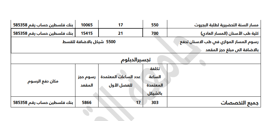وفي الصور التالية، أسعار ساعات كافة التخصصات كما هو منشور على موقع جامعة القدس: -