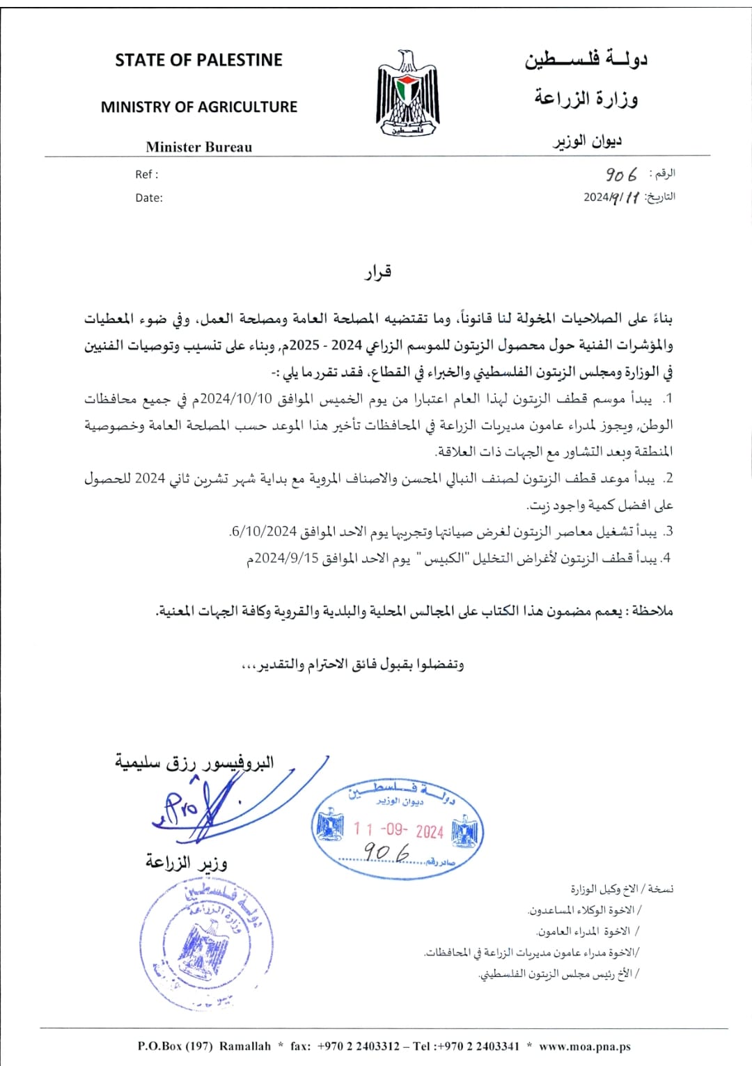 وتابعت، أن تشغيل معاصر الزيتون في محافظات الوطن كافة يبدأ في السادس من الشهر المقبل، بهدف عمل الصيانة اللازمة لها، والتأكد من كفاءة عملها بعد أخذ الإذن الخاص بالتشغيل من مديريات الزراعة في المحافظات.