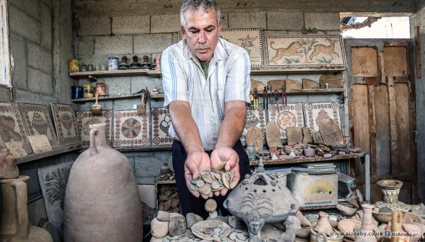 بين مئات القطع الأثرية والمنحوتات الفخارية المتناثرة على طاولة خشبية داخل غرفة صغيرة مسقوفة بألواح "الأسبست" ومطلة على شاطئ بحر مدينة غزة، يقضي الفنان الفلسطيني نافذ عابد (55 عاماً) ساعات طوالا من يومه، محاولا ترميم القطع المحفوظة لديه وإعادة صناعة بعضها وتقليدها بمهارة ودقة عالية.