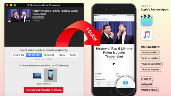 مع تطبيق Softorino YouTube Converter يمكن لمستخدمي أجهزة "آيفون" و"آيباد" العاملة بنظام تشغيل iOS تحميل مقاطع الفيديو إليها بشكلٍ مباشر عن طريق ربط الجهاز مع جهاز ماك، ومن ثم استخدام التطبيق في تحميل أي فيديو بأي دقة مطلوبة على الجهاز الذكي.
