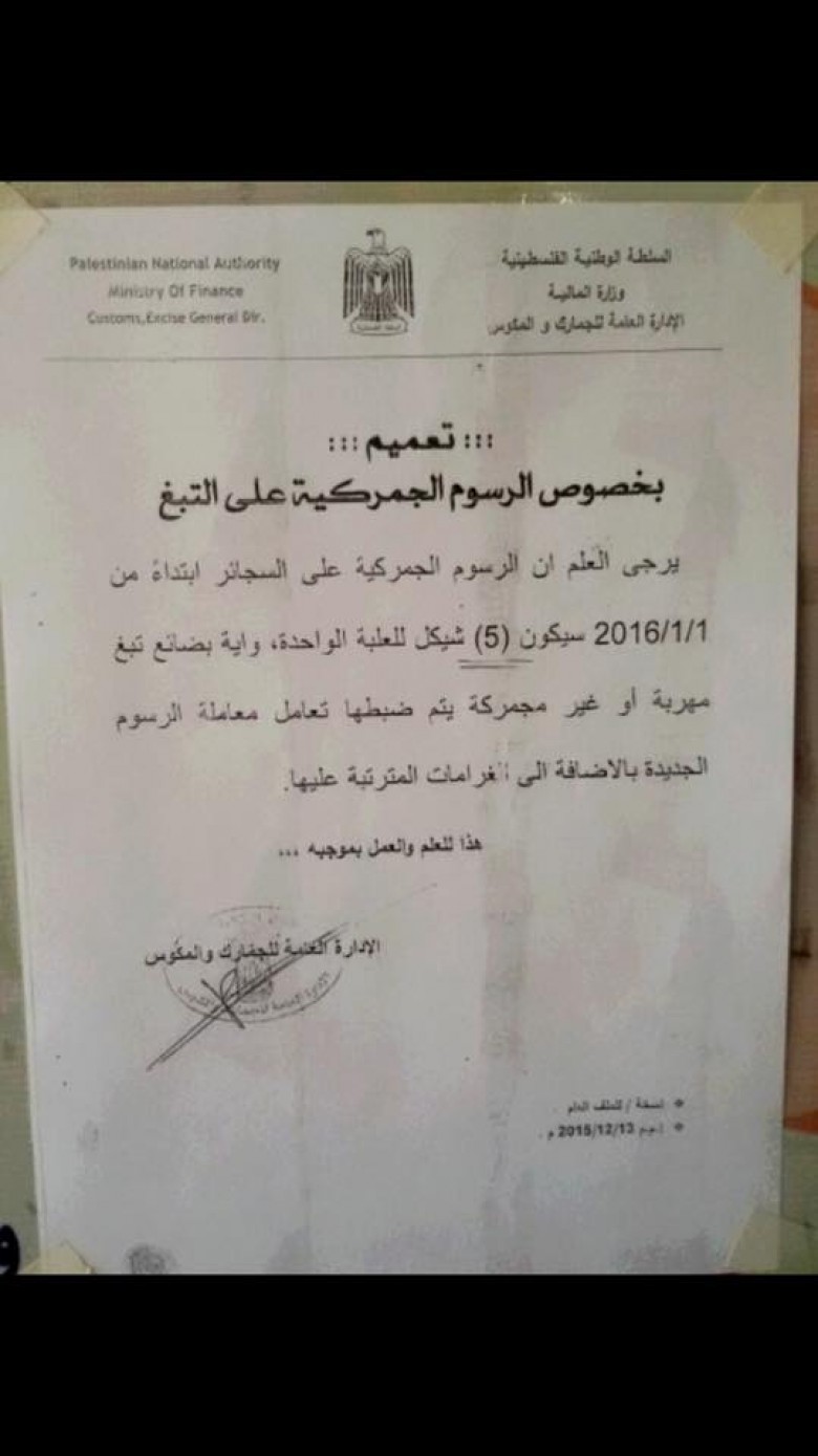 وأوضح أنه سيجري العمل بالرسوم الجديدة إبتداءاً من شهر يناير العام القادم 2016،مشيراً إلى أن قيمة الجمرك المفروض على كل علبة سجائر في الضفة الغربية هو 16 عشر شيقل.