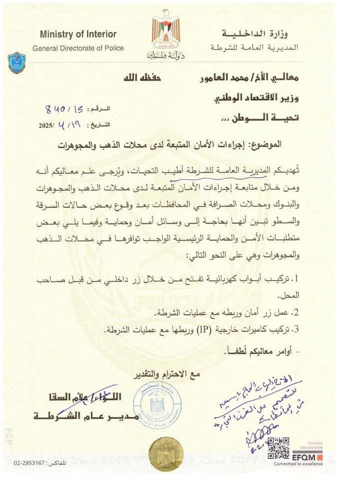 وقالت المديرية في كتاب وجهته إلى وزير الاقتصاد محمد العامور، إنه ومن خلال متابعة إجراءات الأمان المتبعة لدى محلات الذهب والمجوهرات والبنوك ومحلات الصرافة في المحافظات بعد وقوع بعض حالات السرقة والسطو، تبين أنها بحاجة إلى وسائل أمان وحماية.