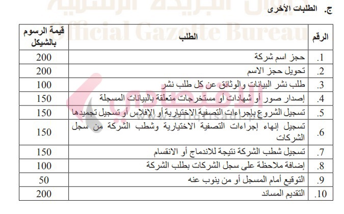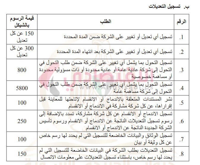 رسوم تسجيل الشركات والتي تبدأ من 400 شيكل وتصل إلى 5800 شيكل وفق الجدول رقم 1