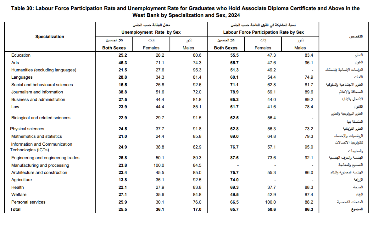 ومن بين أعلى معدلات للبطالة لدى الحاصلين على شهادة دبلوم متوسط أو بكالوريوس في الضفة الغربية، جاء تخصص الرفاه والذي يشمل مجالات الدراسة المتعلقة بالرعاية الاجتماعية والخدمات الاجتماعية بنسبة 27.1%.