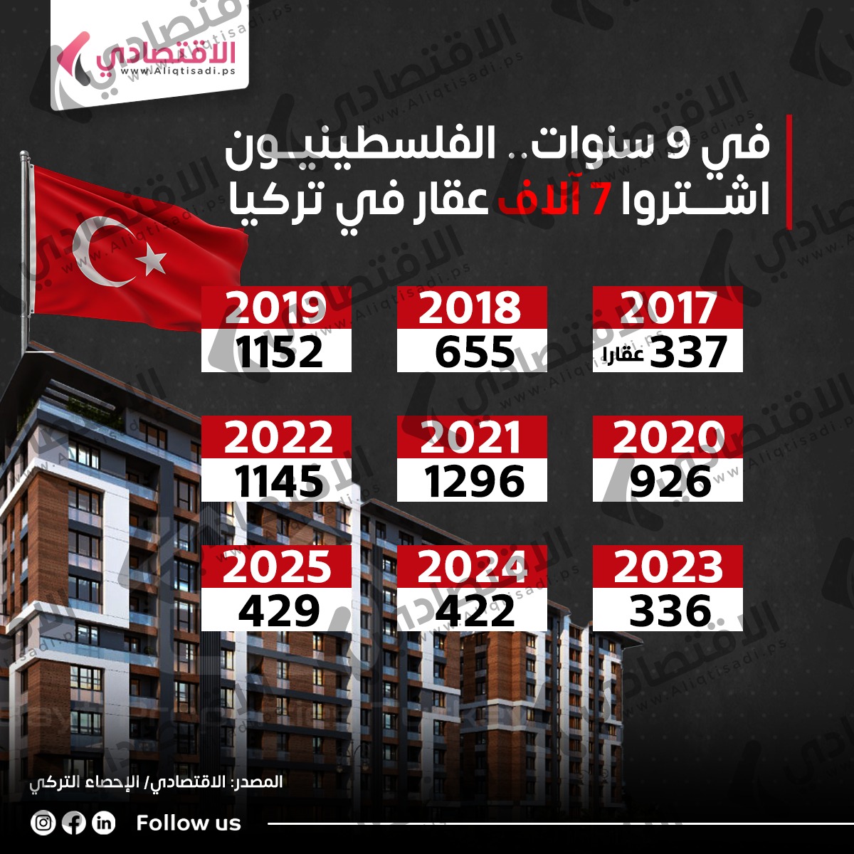 وفي عام 2022، اشترى الفلسطينيون 1145 عقارا في تركيا، قبل أن تتراجع الأرقام بشكل ملحوظ في عام 2023 إلى 336 عقارا