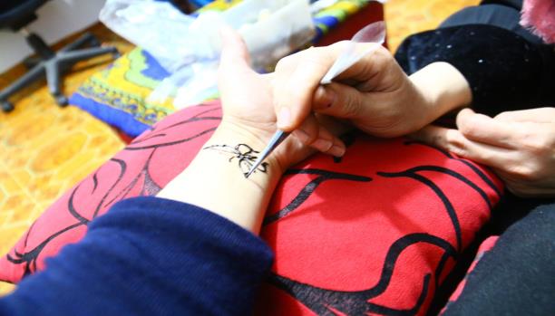 يبدو التعب على وجهها، تحاول أن تلبي كافة الطلبات، وأن ترضي جميع الأذواق. قبل 10 سنوات، امتهنت وفاء عمل "نقش الحناء" للنساء، وتعتبر أن موهبتها سر نجاحها في العمل. تقول لـ "العربي الجديد": "كنت أنقش الحناء لصديقاتي في المدرسة، عندما كنت أقيم مع عائلتي في المملكة العربية السعودية، ولكنني لم أفكر يوماً أن امتهنها، إلا حين شح رزقنا، وضاقت بنا سبل العيش".