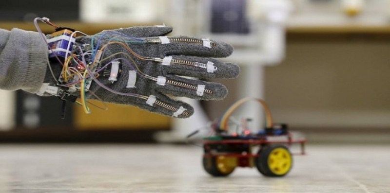 هذا القفاز الذكي مزود بحساسات (مُستشعرات) وأجهزة الكترونية أخرى تبعث رسائل للروبوت وهو عبارة عن سيارة ليتحرك ويلف.