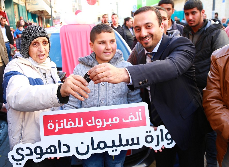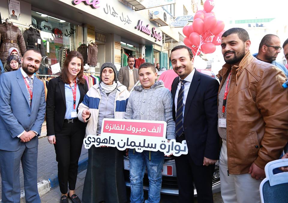 ووسط تجمهر مئات المواطنين في شارع السينما بمدينة بيت لحم، استلمت السيدة نوارة داهودي سيارتها الميتسوبيشي التي فازت بها ضمن حملة "وحد أرقامك وحقق أحلامك"، بعد أن جمعت الأرقام المتشابهة مقابل سيارة.