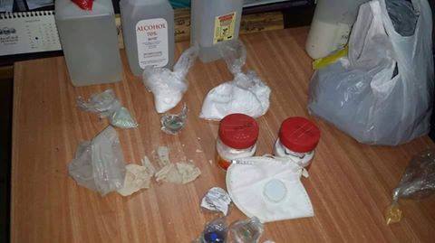 وضبط داخل المختبر مادة بيضاء اللون يشتبه أنها مخدرة، ومادة بيضاء يشتبه انها مادة mda المخدرة، وخلطة الكريستال، وأشكال مختلفة من العظام والضروس تدخل في تصنيع المواد المخدرة، ومواد سائلة ومحاليل طبية، وكمية من الحبيبات الزجاجية من مختلف الألوان، وعلب صبغات اللون، جميعها تستعمل في تصنيع المخدرات.