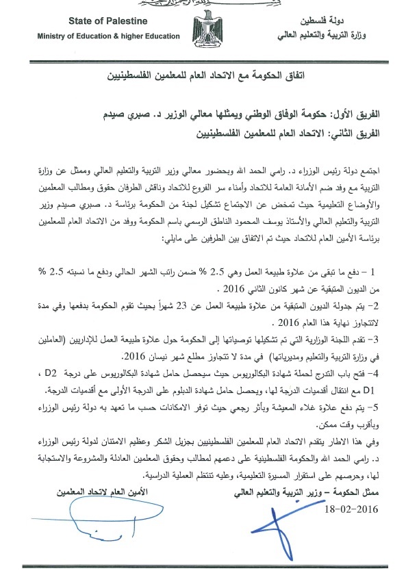 كما أعلنت وزارة التربية والتعليم العالي عن التوصل إلى هذا الاتفاق، ووزعت صورة له مذيلا بتوقيع الأمين العام للاتحاد أحمد سحويل، وممثل الحكومة، وزير التربية والتعليم العالي صبري صيدم.