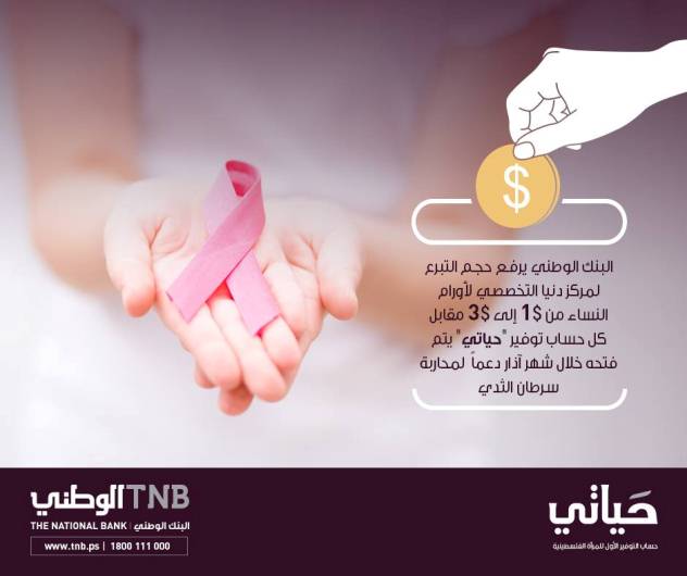 رام الله- الاقتصادي- أعلن البنك الوطني عن قراره رفع حجم التبرع ضمن برنامج التوفير الأول للمرأة الفلسطينية "حياتي" لصالح مركز دنيا التخصصي لأورام النساء من 1$ إلى 3$ مقابل كل حساب توفير "حياتي" يتم فتحه خلال شهر آذار وذلك بمناسبة حلول شهر المرأة ودعما لصحتها في مواجهة المرض الذي يودي بحياة امرأة في العالم كل 15 دقيقة.