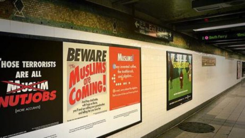 فقد علق عدد من الفنانين الأميركيين المسلمين، العاملين في مجال الكوميديا، ملصقات مناهضة لظاهرة الإسلاموفوبيا، في محطات مترو الأنفاق بمدينة نيويورك. وقامت الفنانة والمخرجة الكوميدية، نيغين فرساد، بالاشتراك مع الفنان الكوميدي "دين عبيدالله"، من أصول فلسطينية، بتعليق ملصقات تتضمن عبارات مناهضة للإسلاموفوبيا، كُتبت بلغة فكاهية، بعد أن حصلا على إذن من دائرة النقل العام في المدينة، نتيجة الشكوى التي تقدموا بها إلى المحكمة، للطعن بقرار منع الإعلانات السياسية التي صدرت عام 2014، بداعي أن القرار ينتهك حقوقهم الدستورية.