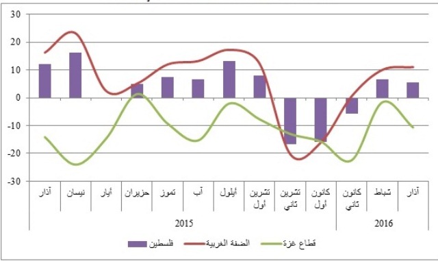 المصدر: سلطة النقد الفلسطينية (2016)، مؤشر سلطة النقد الفلسطينية لدورة الأعمال، آذار 2016.