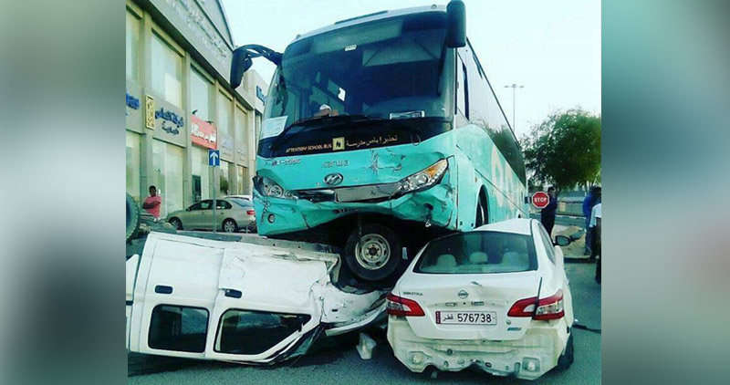 تناقل مستخدمو مواقع التواصل الاجتماعي صورا لحادث صعود باص مدرسة في قطر على سيارتين إحدهما بيك اب والأخرى نيسان سنترا.