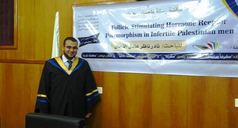 جاءت تلك الدراسة، خلال مناقشة رسالة ماجستير في تخصص التكنولوجيا الحيوية، يوم السبت الماضي، للباحث نادر ناظر النحال بعنوان، " تعدد الأشكال لمستقبل هرمون المنبه للجريب في الرجال الفلسطينيين العقيمين "، في قاعة المؤتمرات بمبنى القدس في الجامعة الإسلامية والتي بموجبها منحت له شئون البحث العلمي والدراسات العليا كليه العلوم قسم التكنولوجيا الحيوية في غزة، درجة الماجستير من قبل لجنة المناقشة والحكم والتي تضم كل من أ.د ماجد ياسين مشرف، د.عبد الله عابد مشرف، د. صائب عويني مناقشي داخلي، ود. صالح موافي خارجي من جامعة الأزهر بغزة.