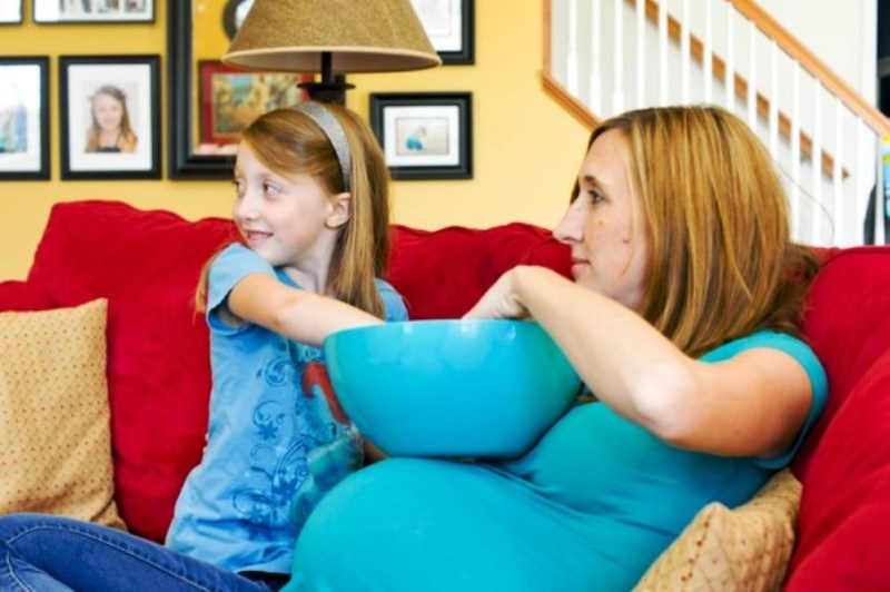 أشارت دراسة أمريكية إلى أن قضاء الحامل أوقاتاً طويلة في مشاهدة التلفزيون يُنجب أطفالاً بدناء، لأنها تُشغل نفسها بتناول الطعام أثناء مشاهدة البرامج والمسلسلات والأفلام، وبالتالي سوف تُنمي هذه العادة السيئة لأطفالها، فتميل إلى إطعام طفلها أمام التلفزيون، فتعطيه مقداراً أكثر مما يحتاجه جسمه.