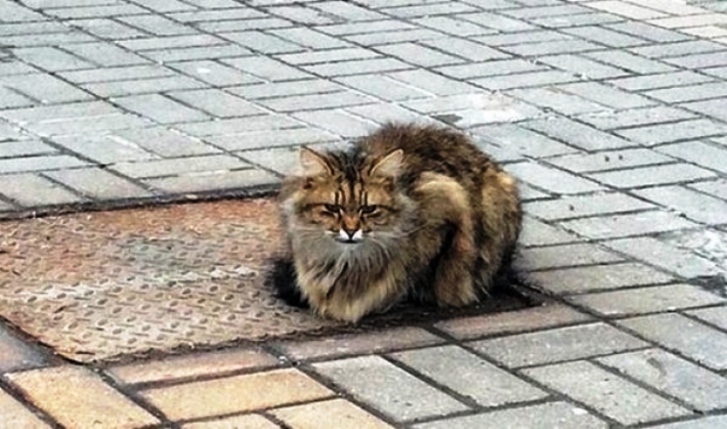 فتلك القطة لم تبرح مكانها منذ نحو عام، حيث تجلس فوق بالوعة بأحد أحياء بلغورود الروسية.