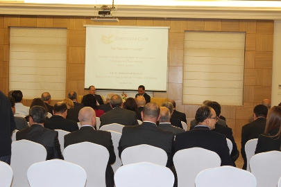 Executive Club في رام الله الدكتور محمد مصطفى، نائب رئيس الوزراء ووزير الاقتصاد الوطني، في الجلسة الثالثة من "منتدى المتحدثين"، والتي تم خلالها مناقشة الخطة الفلسطينية لإعادة إعمار قطاع غزة مع ما يقارب 100 شخصية من قادة الاقتصاد والمستثمرين الفلسطينيين وأعضاء نادي الاعمال وبمشاركة رجال أعمال من قطاع غزة