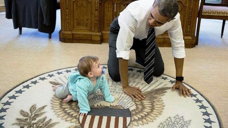 نشر البيت الأبيض في الـ "فيسبوك" صورا للرئيس باراك أوباما وهو يلعب زاحفا على السجادة مع طفلة جين بساكي مديرة الاتصالات في البيت الأبيض. وأثارت الصور الحيرة بين مستخدمي " فيسبوك".