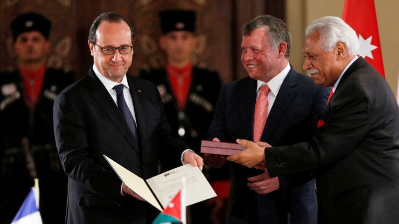 وأكد هولاند أن بلاده ستدعم الأردن في المجالات الاقتصادية، خصوصا فيما يتصل بتسهيل قواعد المنشأ لغايات التصدير إلى دول الاتحاد الأوروبي، ودعمها لتنفيذ قرارات مؤتمر لندن للمانحين المتعلقة بدعم الدول المستضيفة للاجئين السوريين.