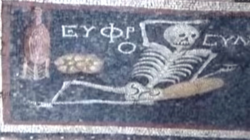 وتظهر صورة الفسيفساء التي ترجع إلى ولاية هاتاي التركية (مدينة أنطاكية القديمة) هيكلا بشريا يمسك إناء من خمر وقد كتبت على الأرضية عبارة باللغة اليونانية القديمة: "افرح وتمتع بالحياة".