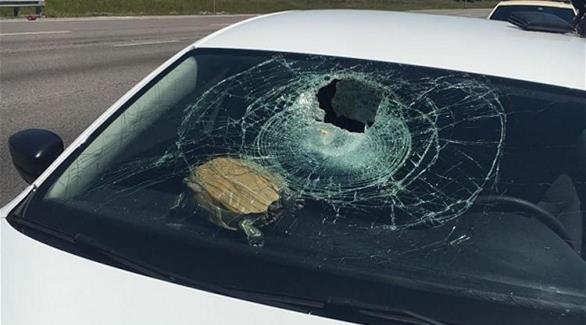 ونقلت "أي بي سي" عن متحدث باسم الشرطة قوله إن السلحفاة وصلت إلى الواجهة الأمامية للسيارة بعد أن صدمتها سيارة أخرى كانت أمامها.