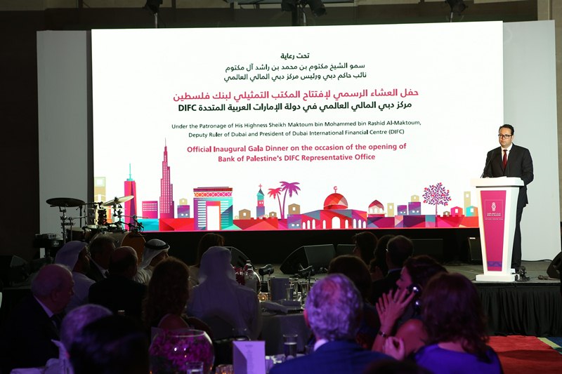 وجرى الإعلان عن هذا الافتتاح الجديد وبدء العمل فيه خلال حفل أقامه البنك في فندق جميرا بيتش، تحت رعاية سمو الشيخ مكتوم بن محمد بن راشد آل مكتوم، نائب حاكم دبي، رئيس مركز دبي المالي العالمي، وبحضور السيد عزام الشوا، محافظ سلطة النقد الفلسطينية، والسيد هاشم الشوا، رئيس مجلس الإدارة، والمدير العام لبنك فلسطين، وسعادة عيسى كاظم، محافظ مركز دبي المالي العالمي، وسعادة محمد علي بن زايد الفلاسي، نائب محافظ مصرف الإمارات العربية المتحدة المركزي، وعدد من رجال الأعمال الفلسطينيين المغتربين من تشيلي، وماليزيا، أمريكا وأوروبا وفلسطين والإمارات ودول الخليج العربي، بالإضافة الى حشد من الصحفيين والاعلاميين.