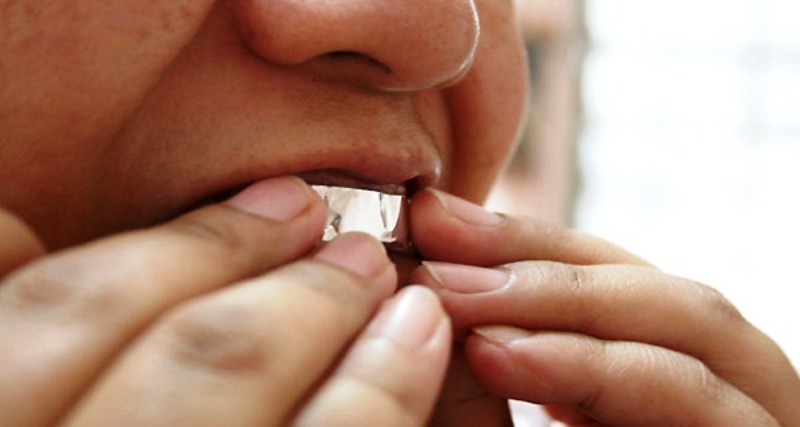 خذ قطعة من رقائق الألمونيوم على طول أسنانك.