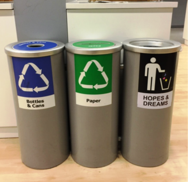 ماذا لو استطعت أن ترمي أحلامك وأمنياتك التي لم تتحقق في حاوية مخصصة لذلك؟ كانت هذه فكرة أحدهم حين قام بوضع حاوية لرمي الأحلام والأمنيات الميؤوس من تحققها؛ إلى جانب حاويات إعادة التدوير، لاقت الفكرة استحسان الناس، فيا تُرى ماذا وجدوا داخلها؟ تابع بالصور كما ورد على موقع Pleated Jeans: