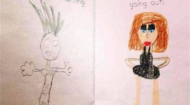 وعلى ورقة "إيه 4" كبيرة قسمتها الطفلة نصفين، رسمت الطفلة والدتها شبيهة بـ"زومبي" مخيف يستيقظ من النوم بشعر متطاير وعينين تشبهان عيون الوحوش، وكتبت فوق الرسم "هكذا تبدو أمي في الصباح الباكر".