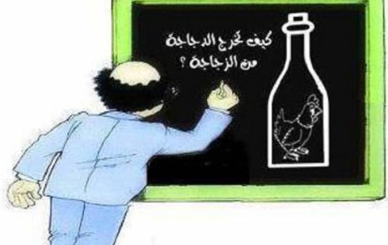 فصرخ أحد الطلبة من آخر الفصل يائساً: يا أستاذ لا تخرج هذه الدجاجة إلا بكسر الزجاجة أو قتل الدجاجة، فقال المعلم: لا