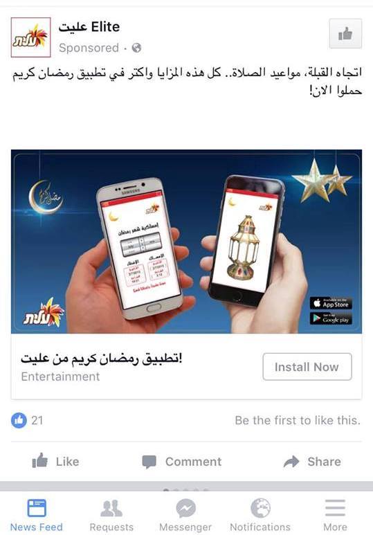 ولجأت شركات مثل "عيليت" و "تنوفا" و"تبوزينا" وسبرينغ" إما إلى طباعة ملصقات على منتجاتها تهنئ المسلمين بقدوم"شهر الخير" أو اطلاق حملات ترويجية عبر صفحاتها على مواقع التواصل الاجتماعي تعلن فيها عن توفير تطبيقات خاصة بتحديد القبلة أو مواعيد الآذان.