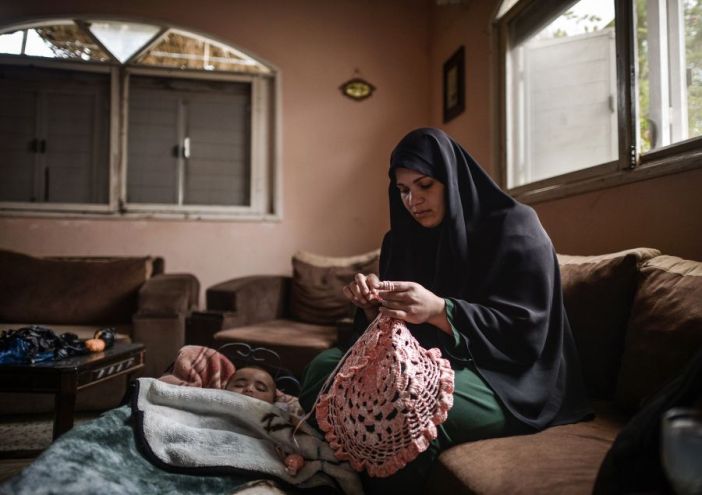 في بيتها جنوب مدينة غزة، وبالقرب من أطفالها، تعمل زينب عزيز (25 عامًا) بجهدٍ كبير لإنتاج مشغولات فنية من أكياس النايلون، تُحقق السيدة بهذا العمل دخلًا لأسرتها وتُوفر أيضًا فرص عمل لأكثر من 20 فتاة وسيدة أنهكتهم مثلها البطالة بعد الدراسة الجامعية.