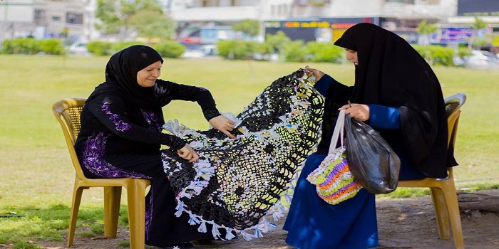 السيدة زينب عزيز (25 عاما) صاحبة فكرة مبتكرة، مبدؤها إعادة تدوير مخلفات البلاستيك والنايلون من خلال مشروع "التراث الجديد" الى أدوات جمالية منوعة من دمى وقبعات وحقائب ومشغولات يدوية للعرائس، وأدوات للزينة.