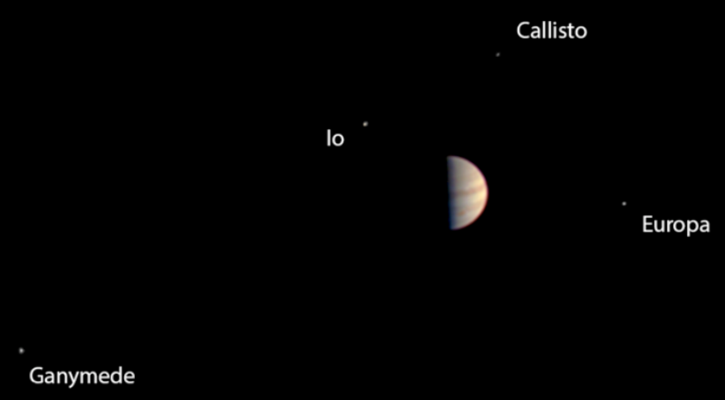 آخر صورة من جونو للمشتري وحوله 4 أقمار، حين كان بعيدا عنه 5 ملايين و300 ألف كلم في 29 يونيو الماضي