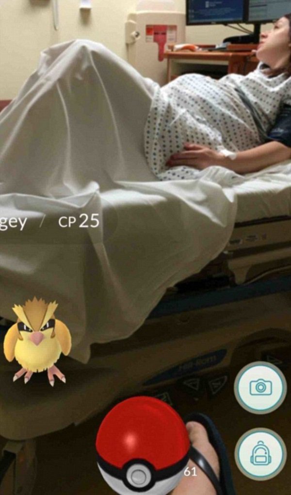 وبناء على الفكرة، ترى الجميع يبحث هنا وهناك عن البوكيمون، في الشوارع والأماكن المغلقة، ولكن قد لا يحالفك الحظ عندما تعثر عليه، فقد يكون الوقت ضيق، أو المكان، ولكن يبدو أن ذلك لم يكن عائقًا لدى البعض، إذ لم يستطع أحد مستخدمي اللعبة أن يمنع نفسه من استكمال عملية البحث، حتى أثناء انتظار وصول مولوده الجديد.