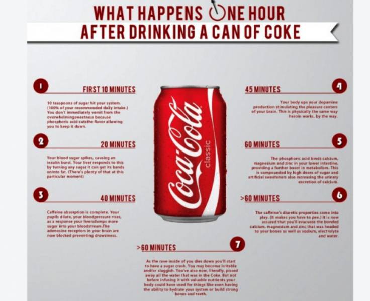 - أول عشر دقائق: بعد الفراغ من شرب قنينة من سعة 330 مل يكون الفرد قد استهلك ما يقارب 25 غراما من السكر أي ما يعادل 7 قطع وهي كمية كبيرة، حيث أن هذا المعدل الطبيعي من السكر الذي يدخل جسم الإنسان في اليوم الكامل، إلا أن حامض الفسفوري الموجود في المشروب يقلل من الشعور بذلك والذي بدوره يؤثر في الكلى، لذا فإن هذه الكمية الهائلة من السكر تعرض جسم الإنسان لأمراض كثيرة من سمنة وسكري وتسوس للأسنان.