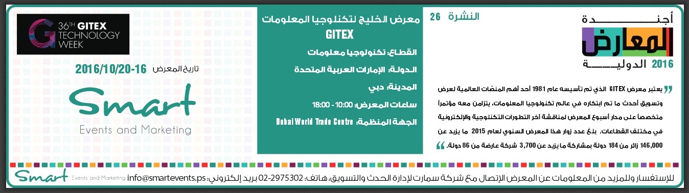 رام الله - الاقتصادي - اعلنت شركة سمارت لإدارة الحدث والتسويق في بيان صحفي صادر عنها عن إصدارها النشرة السادسة والعشرون من أجندة المعارض الدولية والتي تصدرها الشركة منذ بداية عام 2015، والتي تعتبر النشرة الدورية الوحيدة المتخصصة بالمعارض الدولية في فلسطين. النشرة السادسة والعشرون تتناول معرض الخليج لتكنلوجيا المعلومات GITEX وهو أحد أهم المنصّات الدولية التي تقدّم آخر التطورات في مجال تكنلوجيا المعلومات لكافة القطاعات والذي يُقام سنوياً في دبيّ منذ عام 1981.