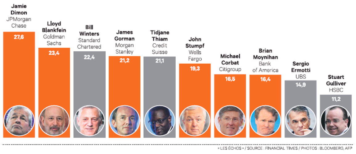 وسادساً، جاء John Stumpf رئيس Wells Fargo بـ 19.3 مليون دولار، فـ Michael Corbet رئيس Citigroup الذي حصل في 2015 على 16.5 مليون دولار، فيما حل ثامناً Brian Moynihan من Bank of America بإجمالي مكافآت وصل إلى 16.4 مليون دولار، فتاسعاً Sergio Ermotti من UBS بـ 14.9 مليون دولار، وآخرهم كان Stuart Gulliver من HSBC براتب سنوي عند 11.2 مليون دولار.