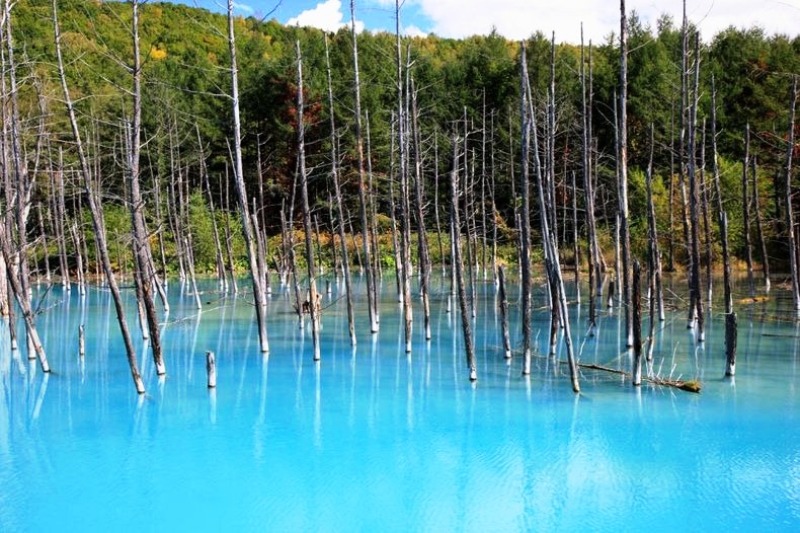 تقع البحيرة على الضفة الشرقية من نهر بيجياوا، جنوب شرق مدينة بيي في هوكايدو، على بعد 2.5 كم شمال غرب الينابيع الساخنة عند سفح جبل توكاشي. استمدت البحيرة اسمها من درجات اللون الأزرق لمياهها، التي تبرز منها جذوع الأشجار.