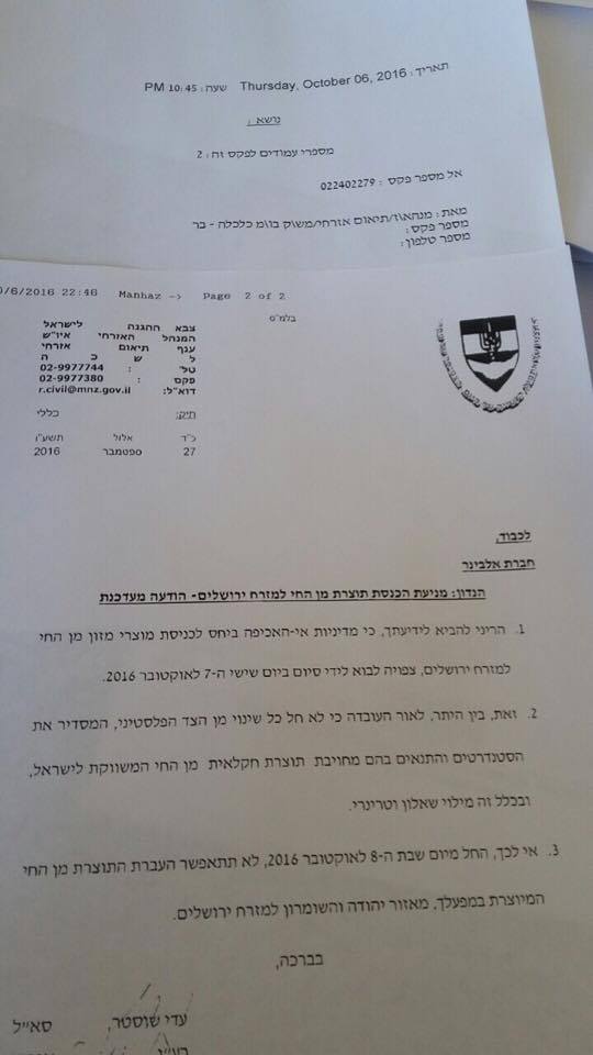 وحصل "الاقتصادي" على كتاب موجه لشركة البينار لمنتجات الألبان، يفيد بمنع إدخال منتجاتها لأسواق القدس، كما حصلت شركتا الريان وحمودة على ذات النسخة من الكتاب.