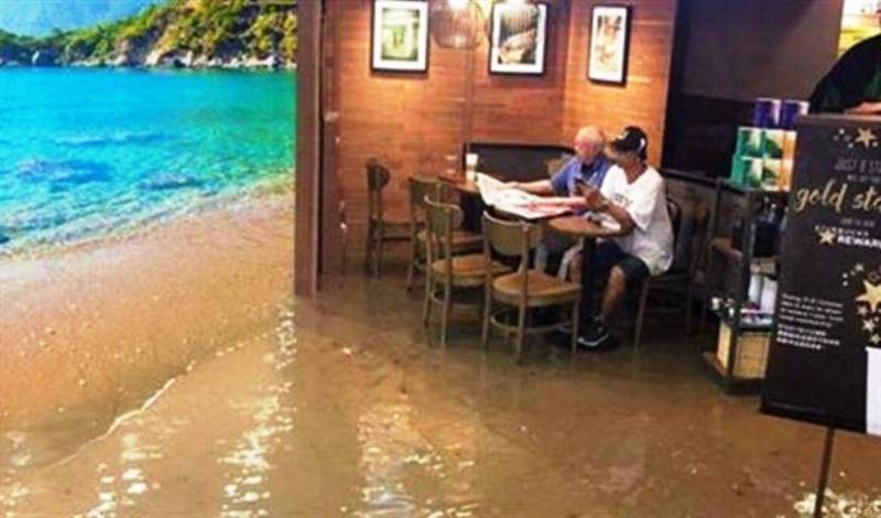 لكن رويداً.. فالوضع لا يتعلق بالقهوة. إنه فيضان حقيقي استطاع أن يدخل المقهى مع وصول الإعصار هيما في الأيام الماضية، ولو نظرنا إلى لون الماء في أرضية المقهى لاعتقدنا فعلاً أنها قهوة تم سكبها بهذه الكميات الكبيرة كنوع من الترويج الجديد، وما أكثر هذه الطرق "البلهاء"، القادرة على اجتذاب المزيد من الزبائن.