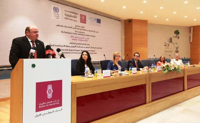 رام الله - الاقتصادي - عقد يوم الاثنين الموافق 24/10/2016 في مقر المركز الرئيسي للإدارة العامة لبنك فلسطين في مدينة رام الله مؤتمراً صحفياً أعلنت فيه هيئة الأمم المتحدة للمرأة ومنظمة العمل الدولية نتائج التدقيق من منظور النوع الاجتماعي والذي يسعى الى تعزيز عملية التعلم الفردي والمؤسساتي بشأن تعميم مراعاة النوع الاجتماعي بشكل عملي وفعّال في العمل، ويأتي كجزء من المبادرة المشتركة ما بين هيئة الأمم المتحدة للمرأة (UN Women) ومنظمة العمل الدولية (ILO) حول "التدقيق التشاركي في المساواة ما بين الجنسين" والعمل مع القطاع الخاص من اجل تعزيز المسؤولية المجتمعية للشركات، وزيادة مشاركة المرأة وتوفير فرص متساوية في سوق العمل