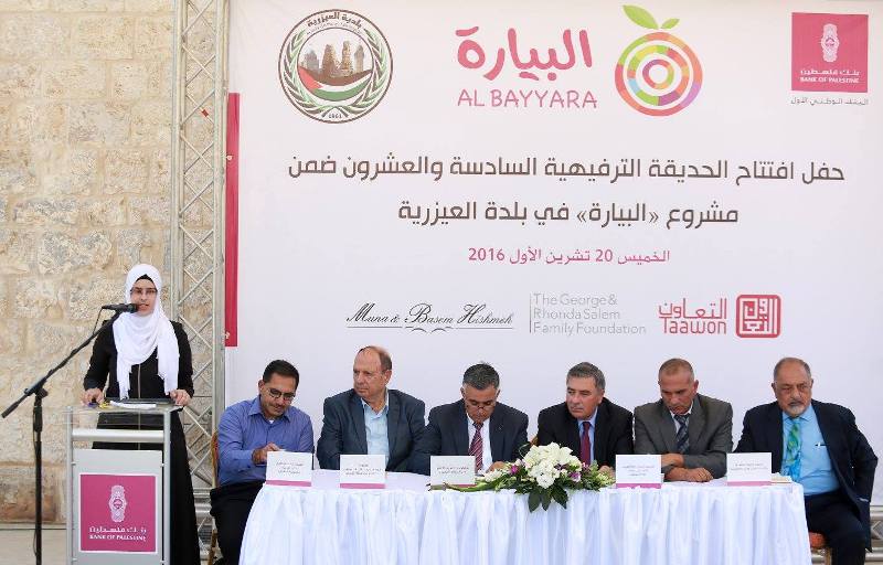 ففي بلدة العيزرية، افتتح البنك الحديقة الترفيهية الخامسة والعشرين في البلدة، وذلك بحضور وزير الحكم المحلي د. حسين الاعرج، ووزير ومحافظ محافظة القدس م. عدنان الحسيني، ورئيس بلدية العيزرية السيد موسى الشاعر، والسيد باسم حشمة رئيس مؤسسة "منى وباسم حشمه"، والسيد رشدي الغلاييني نائب مدير عام بنك فلسطين، والمهندس خالد الداودي ممثلا عن مؤسسة التعاون، والحاجة فدوى ناجي ممثلة عن مؤسسة الجمعية الخيرية المتحدة للاراضي المقدسة نيو جيرزي/نيويورك، بالإضافة إلى عدد كبير من المدعوين وأهالي المنطقة، وعدد من المسؤولين في البنك والمؤسسات الشريكة.