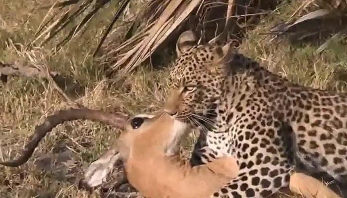 ويظهر في الفيديو نمراً وقد تمكن من غزالة، بعد أن انقض عليها، وظل رابضاً فوقها، بينما يضع فمها بين فكيه. وعلى مقربة منه شوهد أحد الضباع يقترب من المكان، فيما ينذر بنهاية مأساوية لتلك الغزالة.