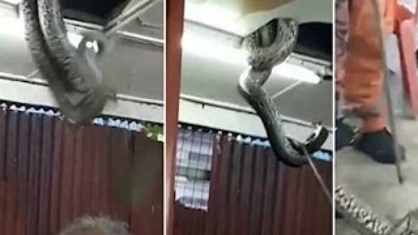 ويظهر في مقطع الفيديو اختراق أفعى ضخمة لسقف المطعم محاولة أن تتدلى منه، فيما يحاول عمال المطعم مساعدة الأفعى على السقوط، بواسطة عصا معدنية لعمل فتحة كبيرة في السقف، بحسب صحيفة ديلي ميل البريطانية.
