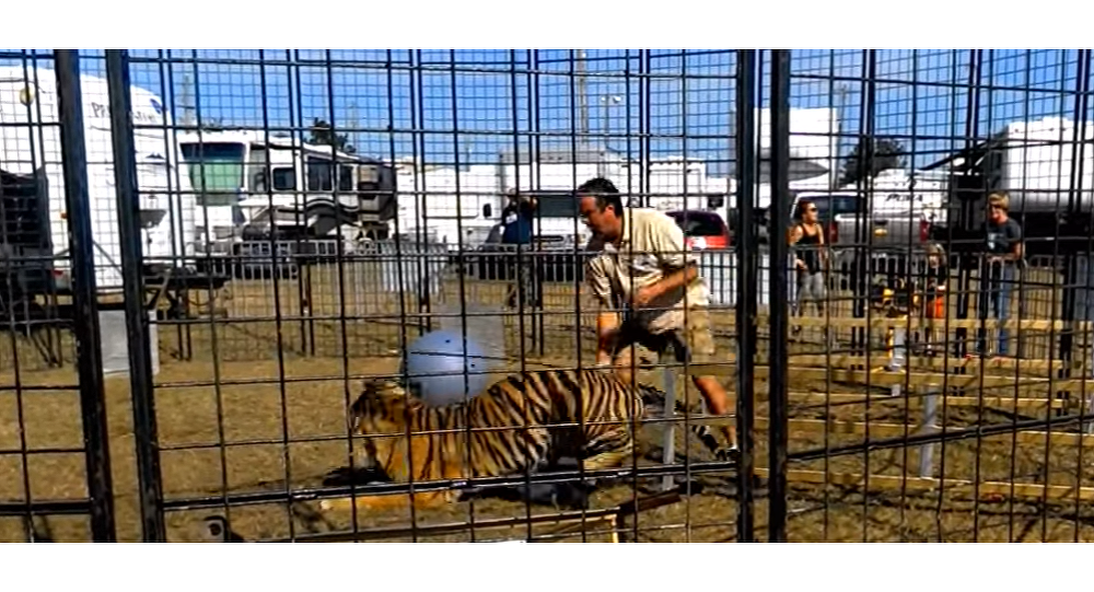 وتظهر المدربة وهي تسقط على الأرض بعد أن هاجمها النمر وسحبها من ساقها، ما استدعى منها ضربه بالعصا مرارا وتكرارا.